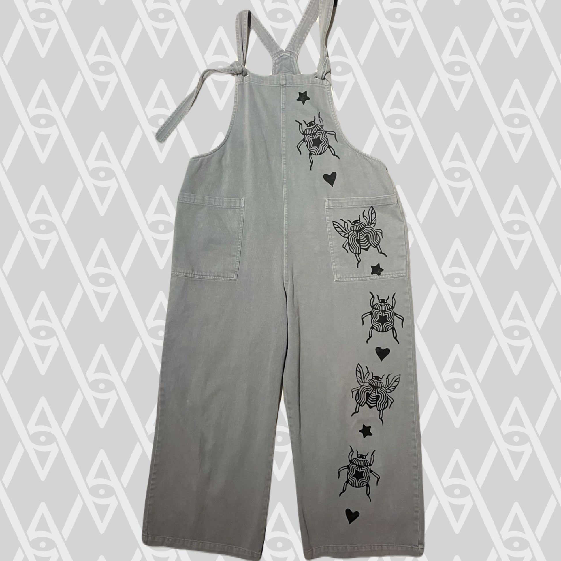 Black beetle stamps on grey denim overalls with tie straps.