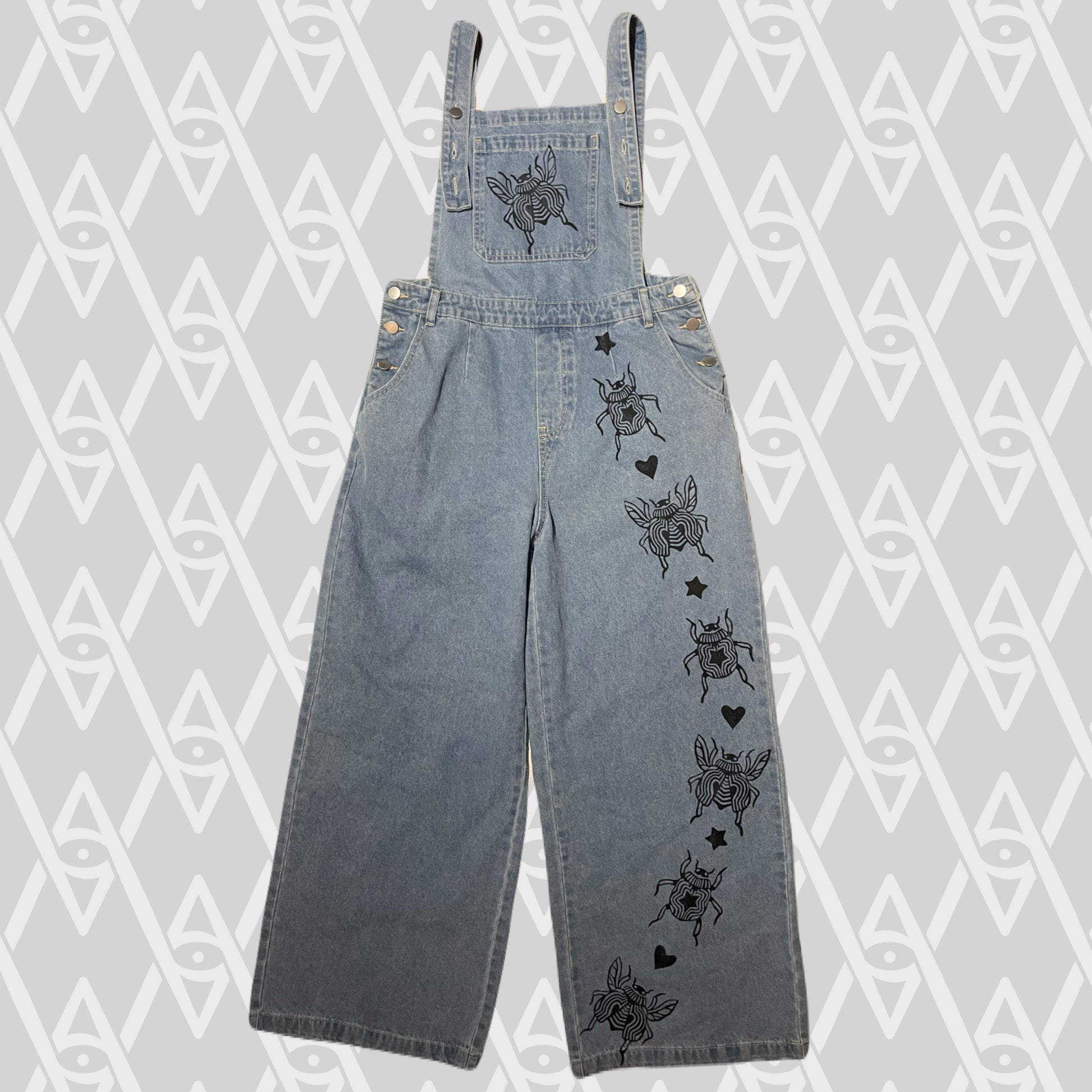 Black beetle stamps on blue denim overalls.