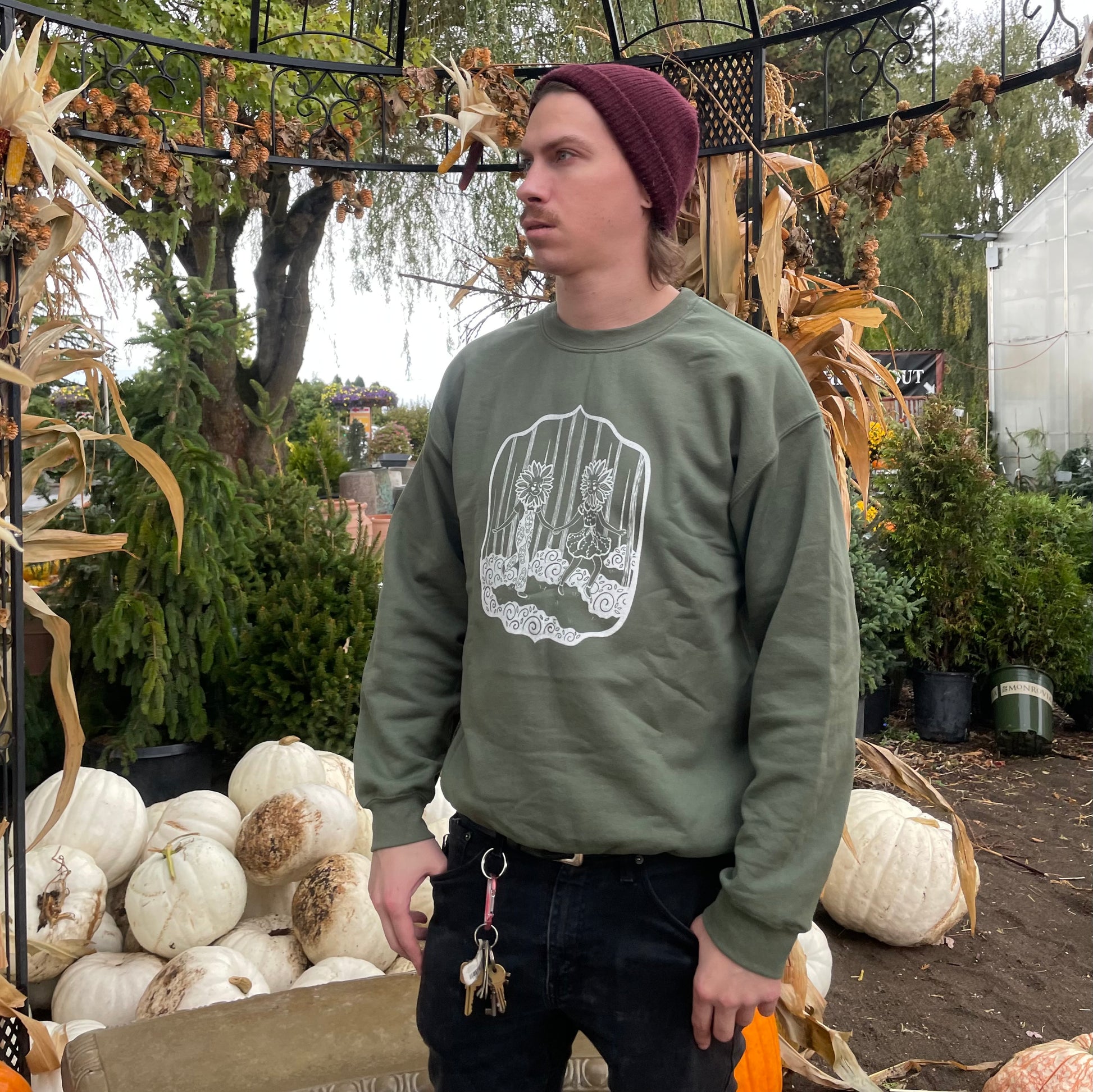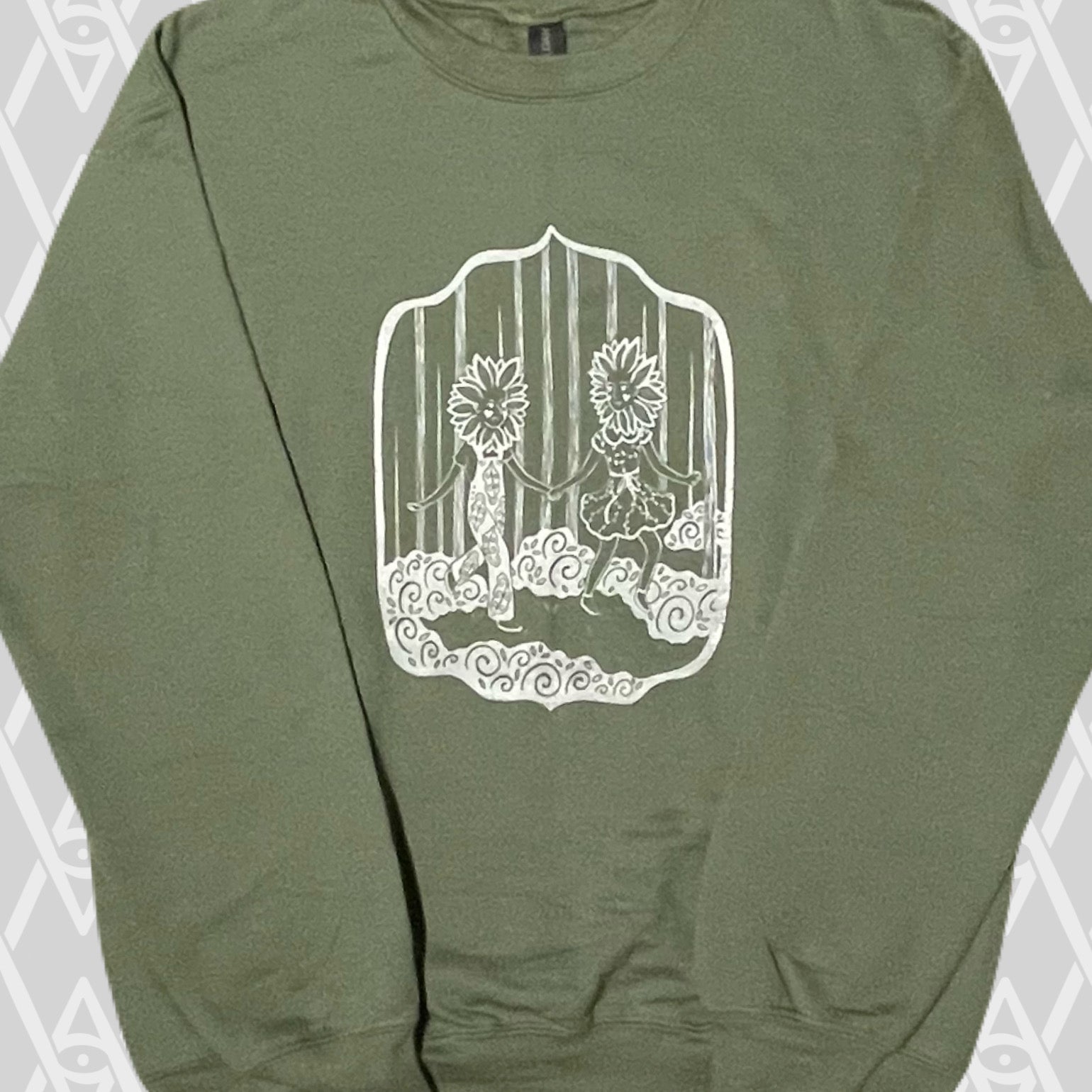 This was designed and screen printed by Ari on 50/50 cotton poly blend Gildan Crewneck sweaters.