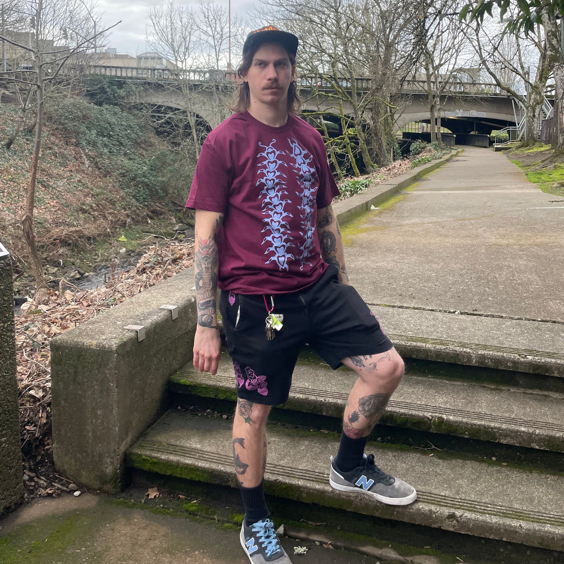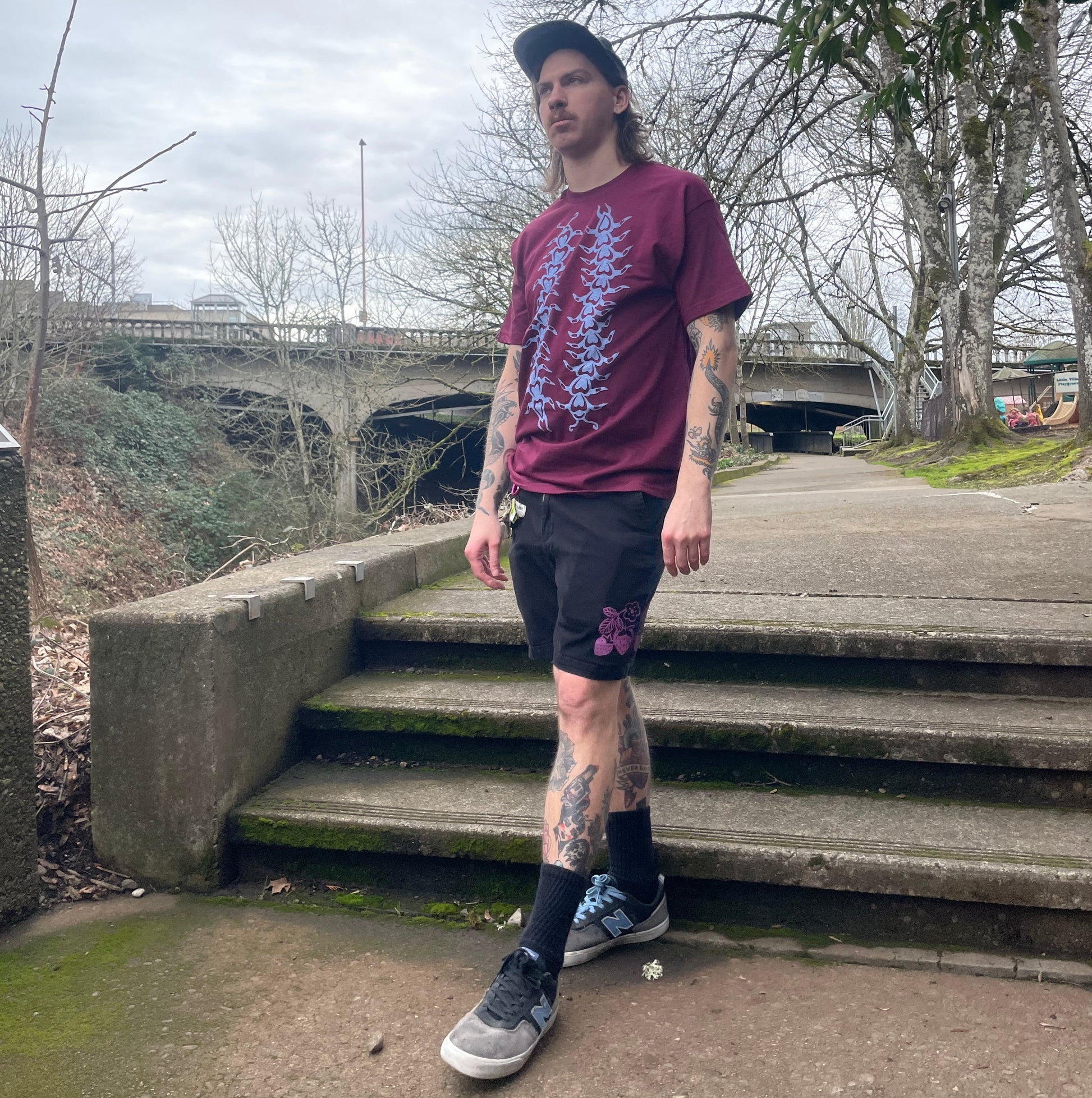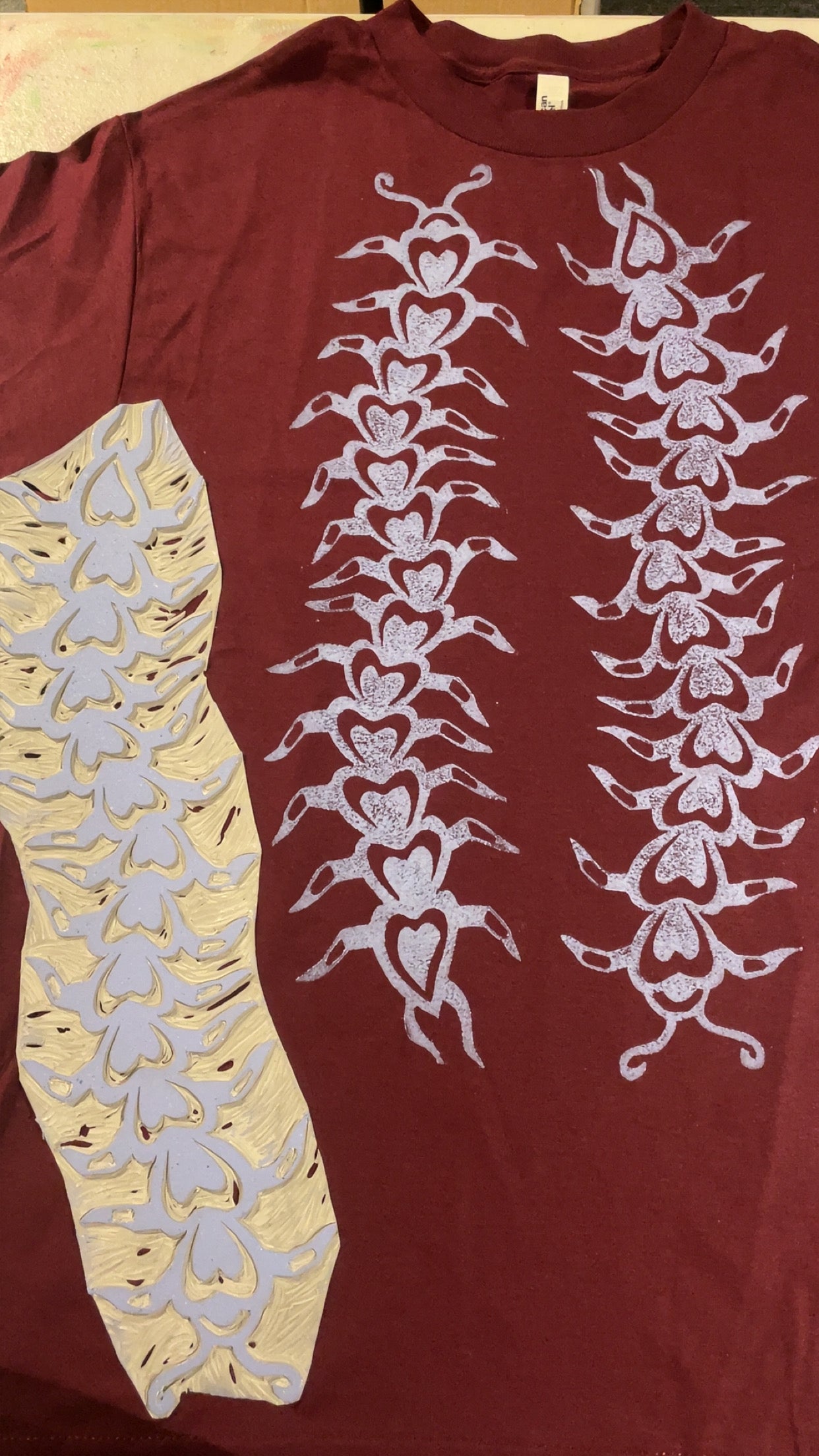 This was designed, hand carved, and hand printed by Ari with light blue ink on burgundy 100% cotton American Apparel shirts.