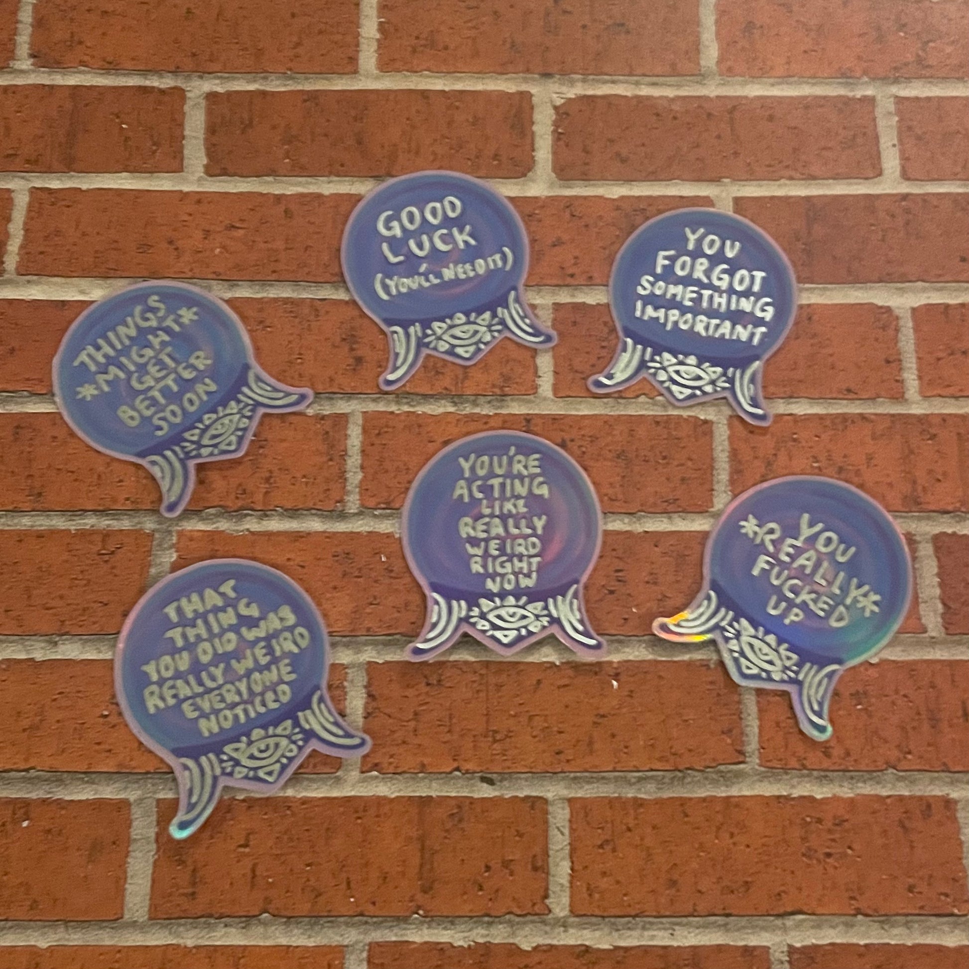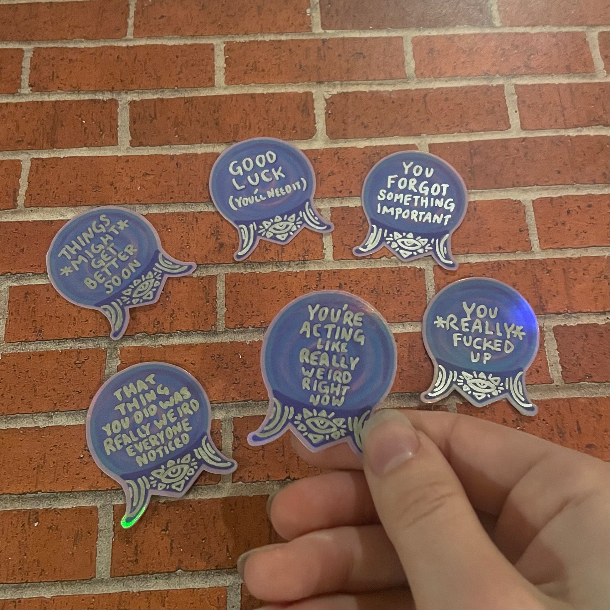 These holographic stickers are waterproof, designed and hand printed, with hand painted lettering in silver by Ari!