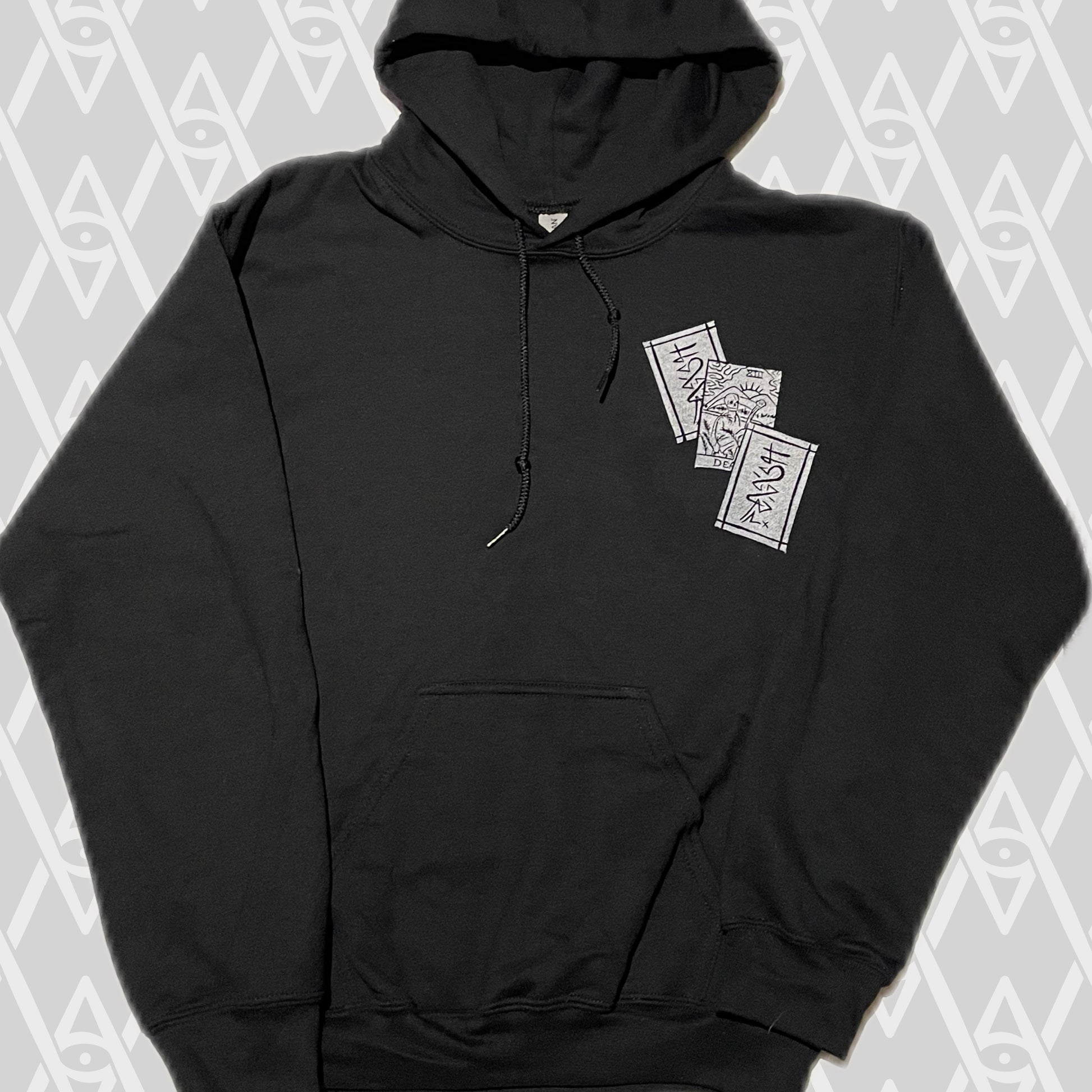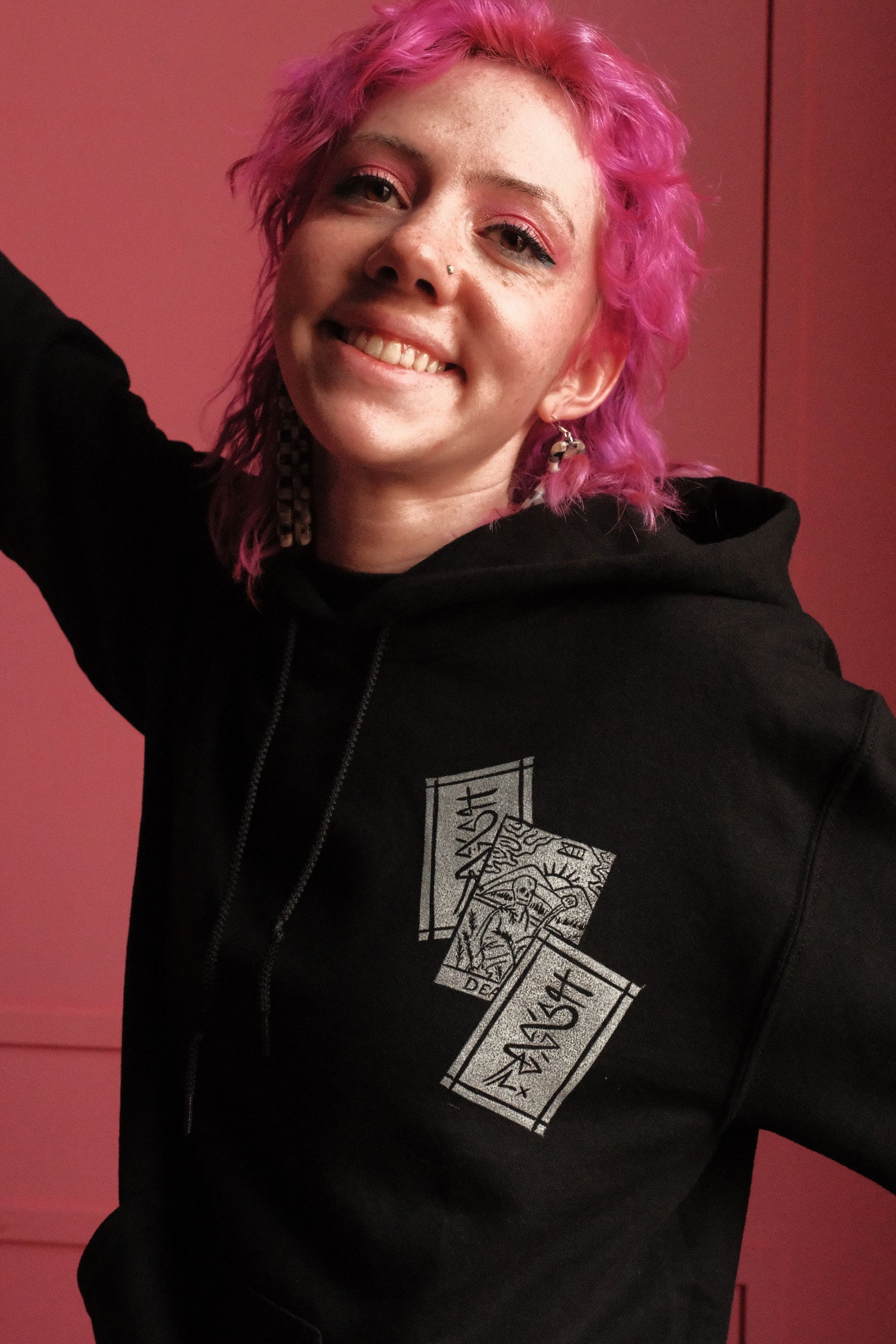 With this tarot card inspired hoodie you’ll be ready for fall and all year round. This was designed, hand carved, and stamped with white fabric ink by Ari on black 50/50 cotton polyester hoodies from Gildan.