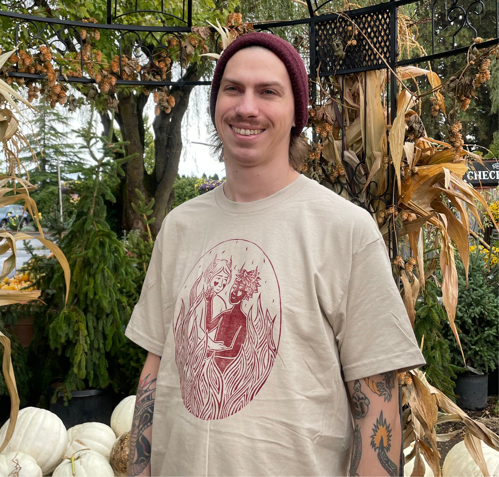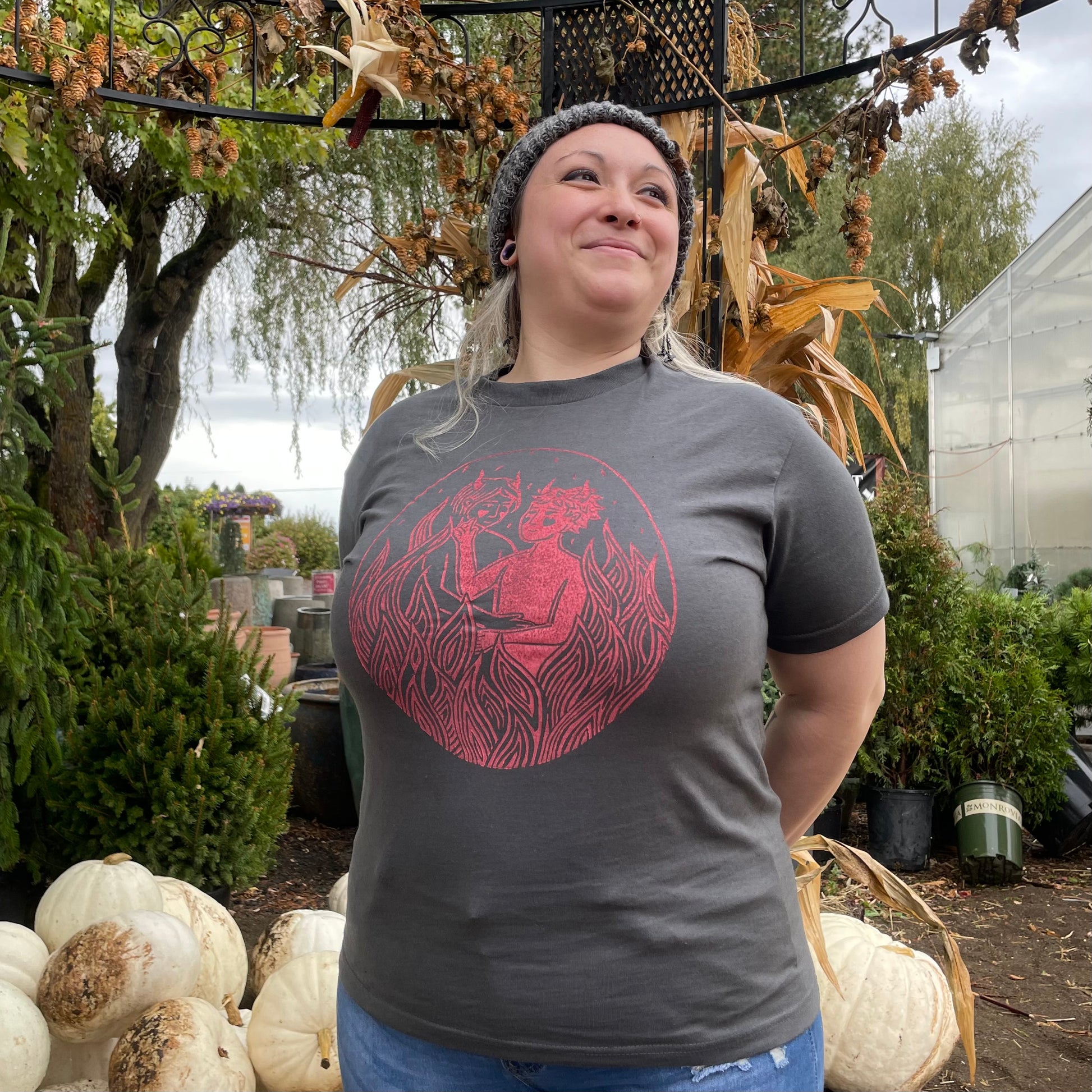 This design was created, hand carved, and hand printed by Ari on 100% cotton American Apparel shirts. They are unisex and preshrunk!