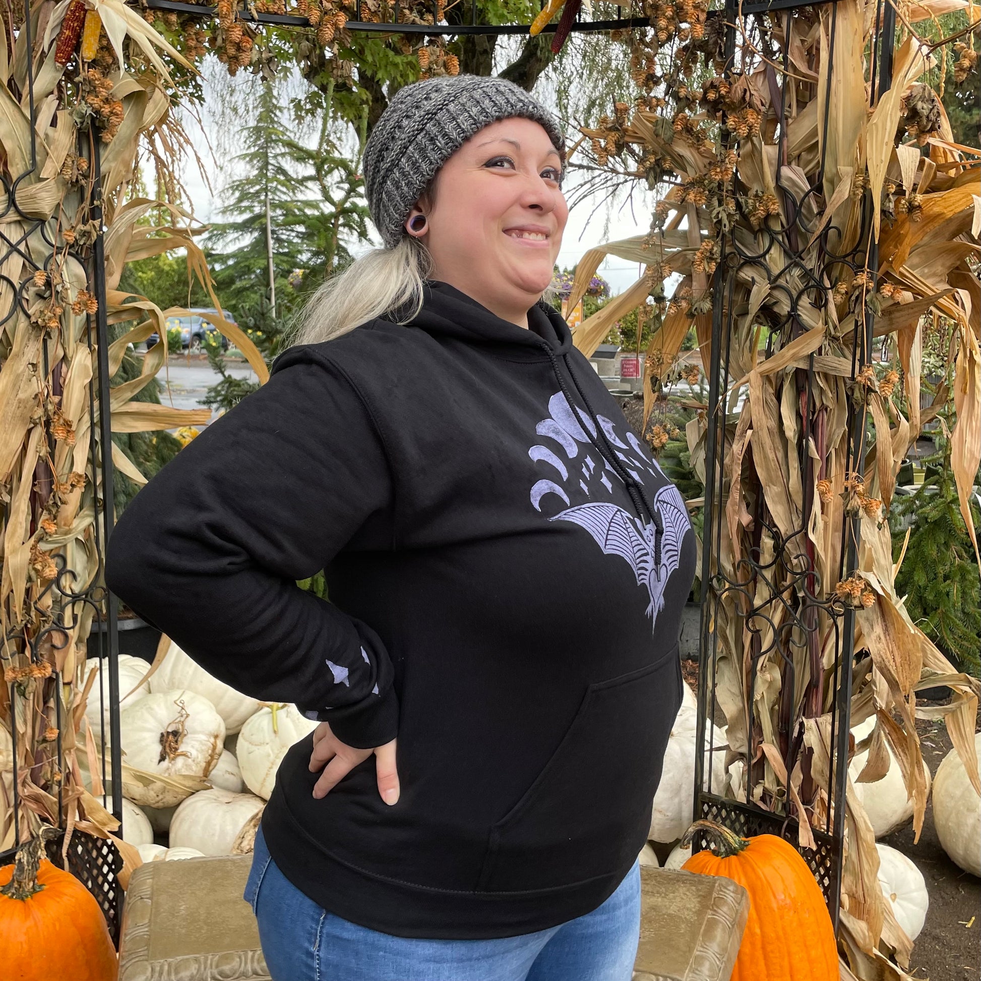 This was designed, carved, and printed by Ari with light purple permanent fabric ink on 50/50 cotton poly blend Gildan hoodies.