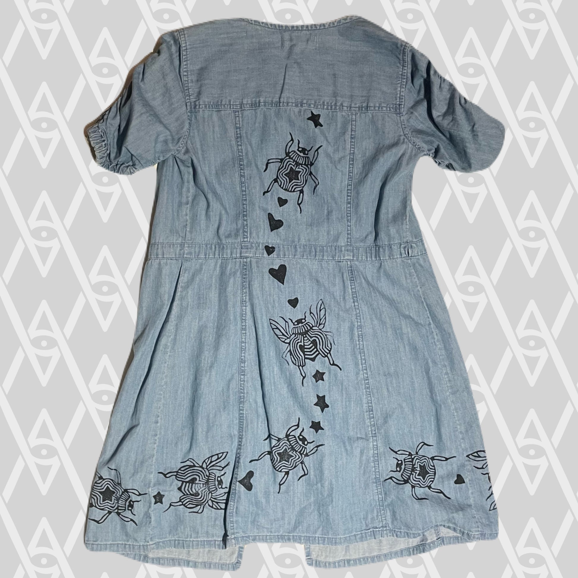 Black beetle stamps on blue denim tie dress, has holes to tie around or could be worn as a coverup.