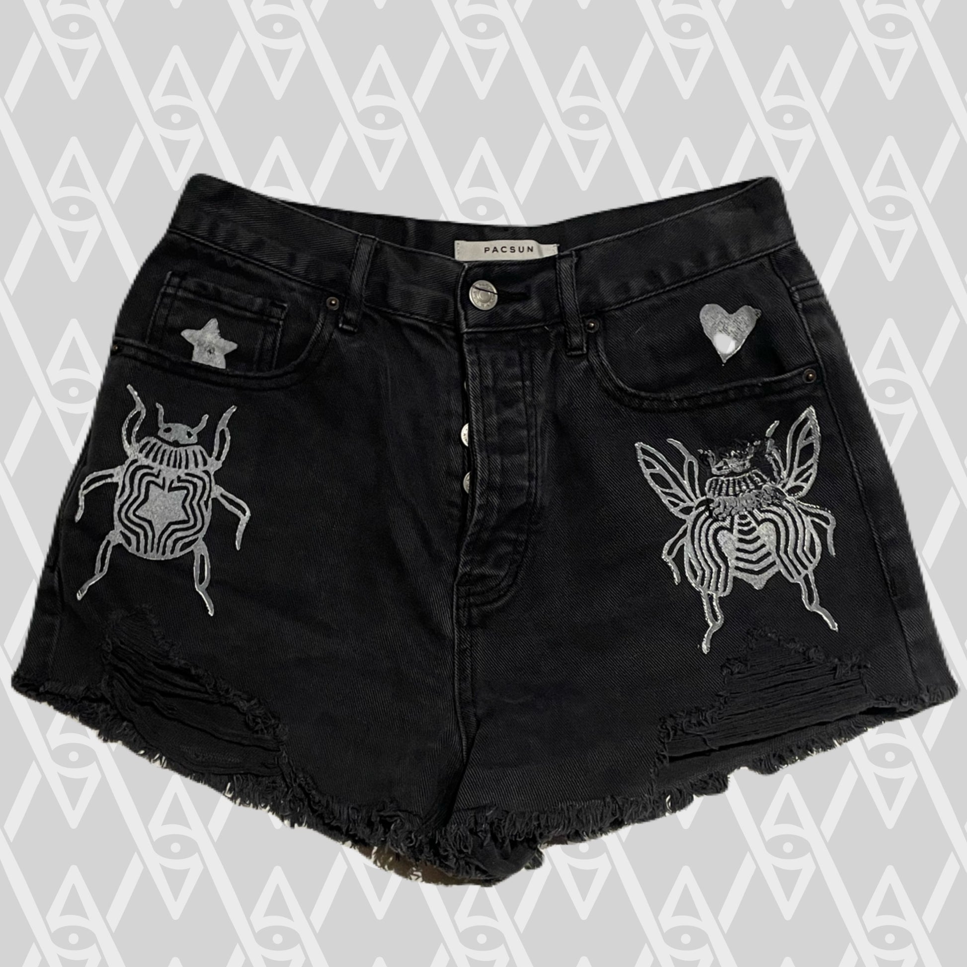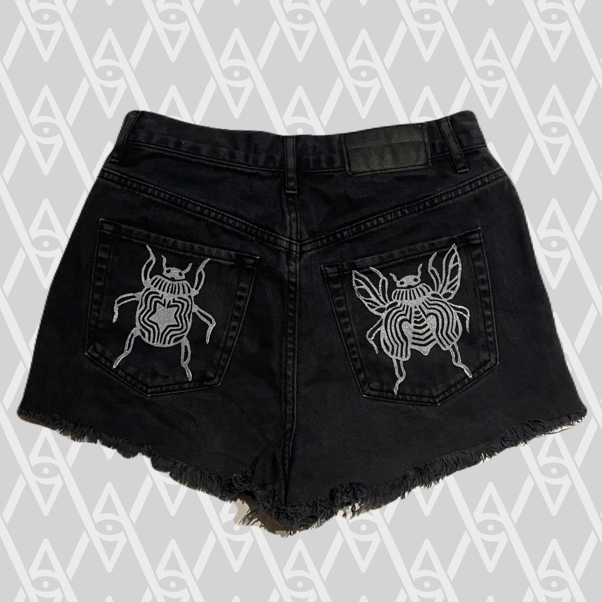 White beetle stamps on black jean shorts.