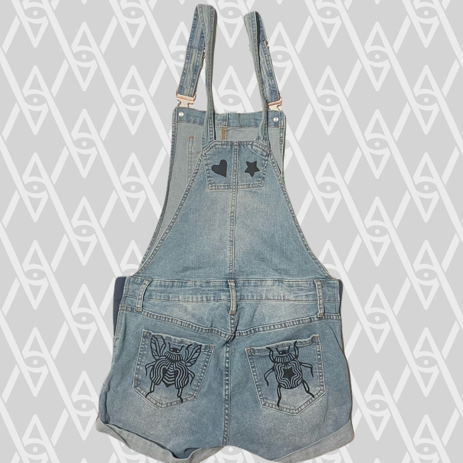 Black beetle stamps on blue denim overalls shorts.