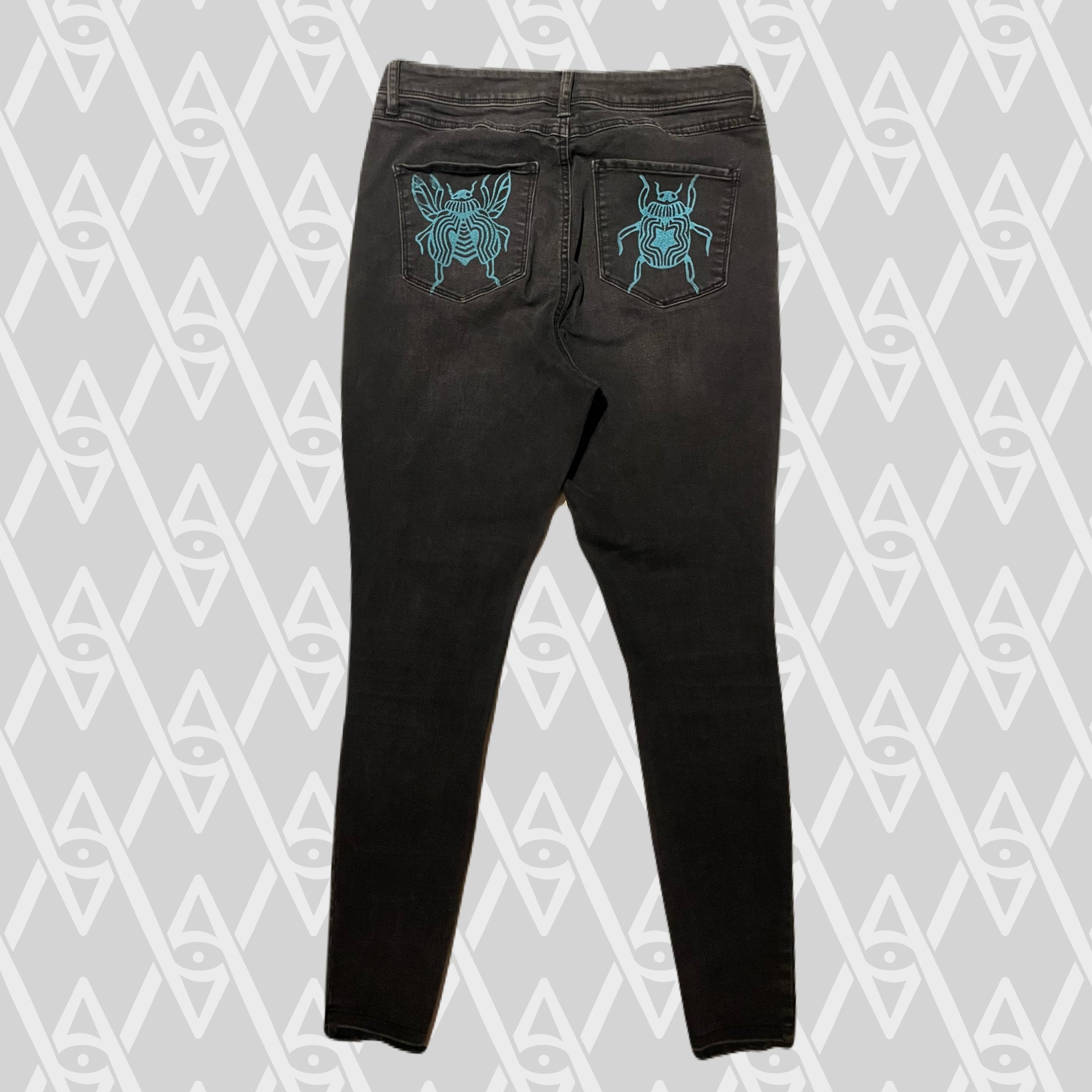Teal beetle stamps on black jeans.