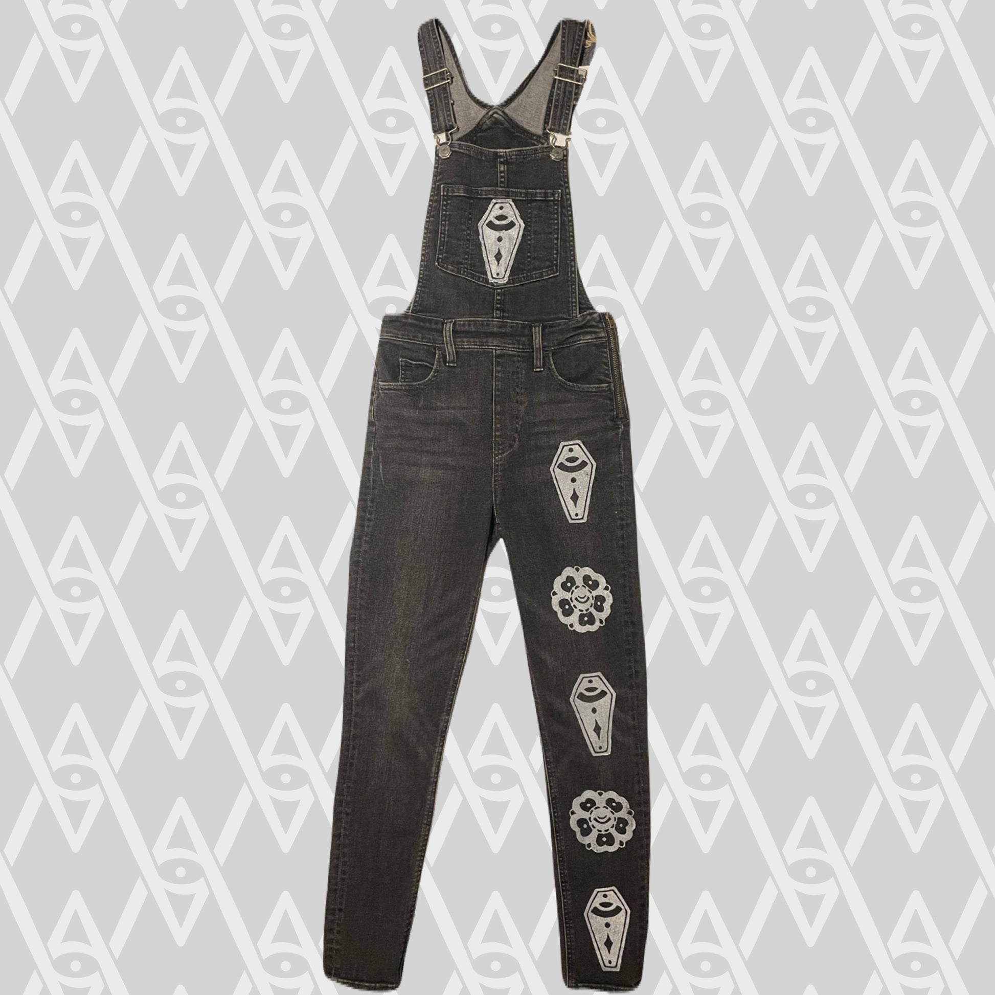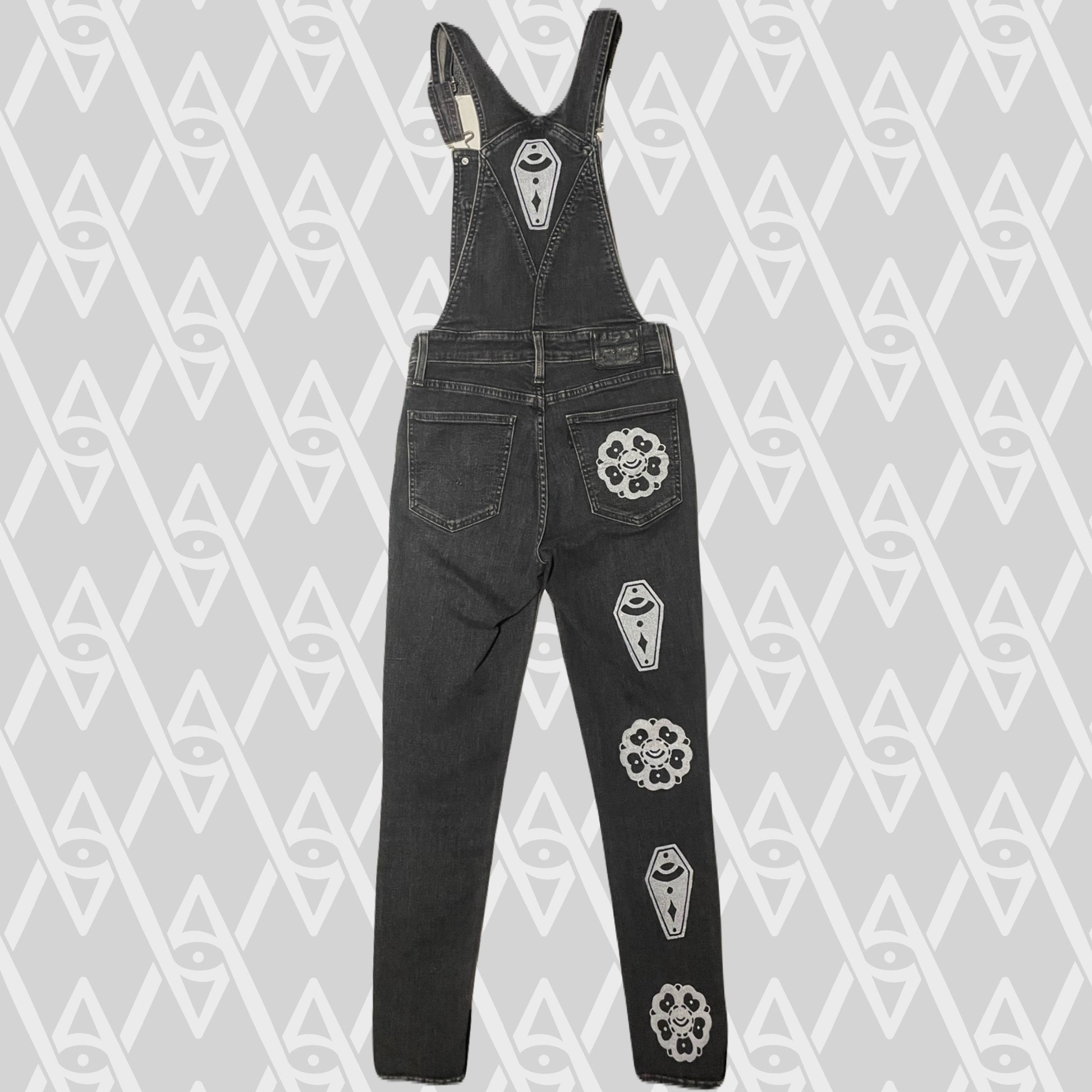 White coffin and flower stamps on black denim overalls.
