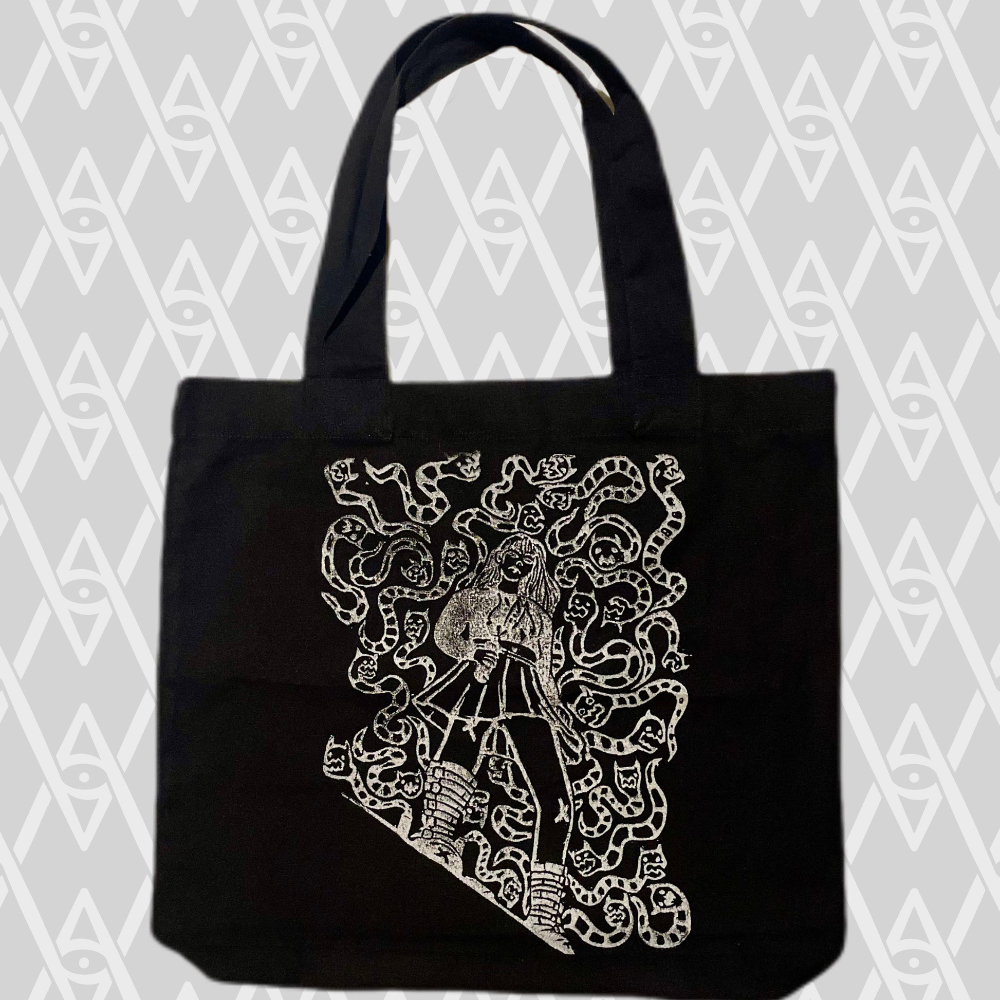 I wanted to make a piece about a girl letting out her inner demons through art- specifically through street art. This piece was hand carved by me, Ari, from linoleum to create a stamp that I then used to linoprint on canvas tote bags