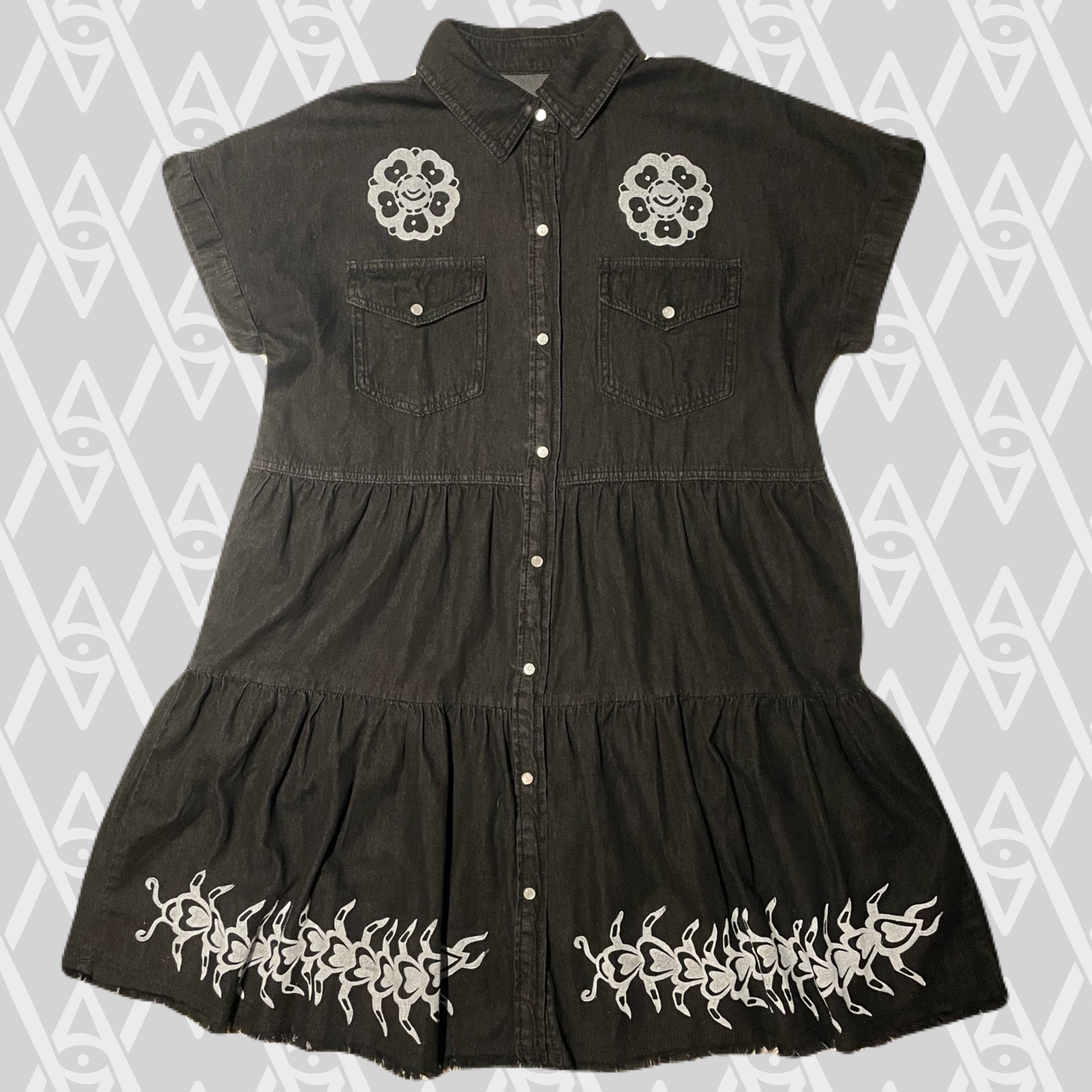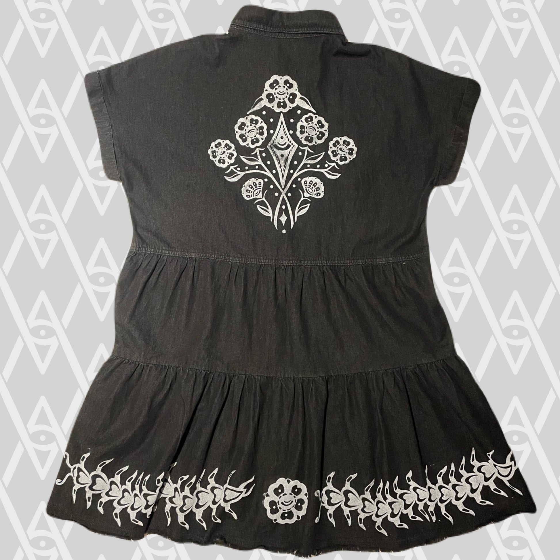 Black denim dress printed with white ornamental flowers on the back and single flowers on the front. There’s centipedes made of hearts printed along the bottom with a single flower in the middle.