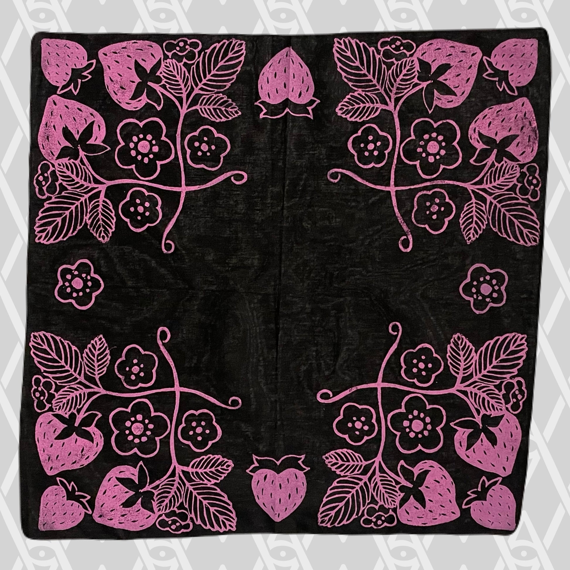 This design was created, hand carved, and hand printed by Ari on 22” 100% cotton bandanas with permanent fabric ink!