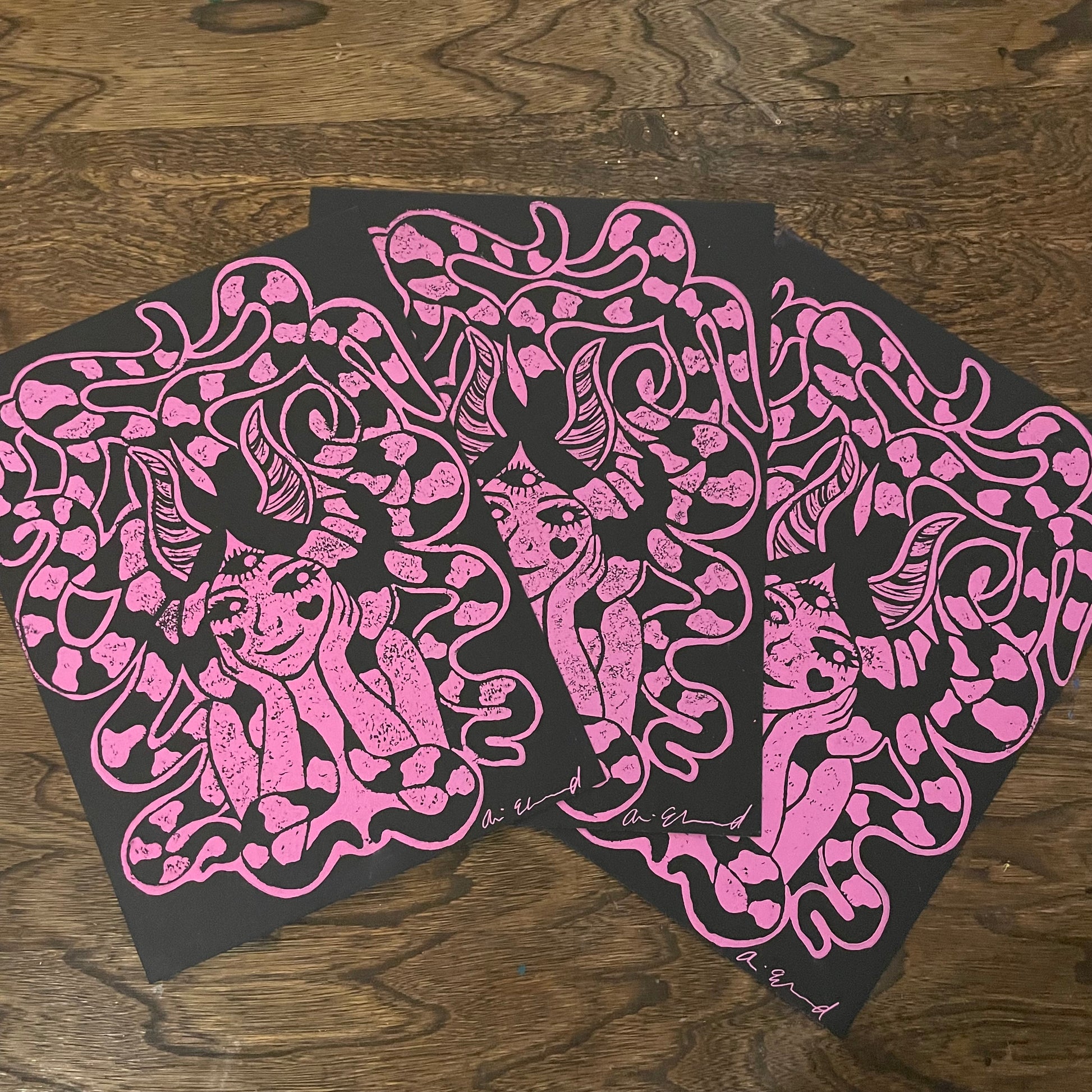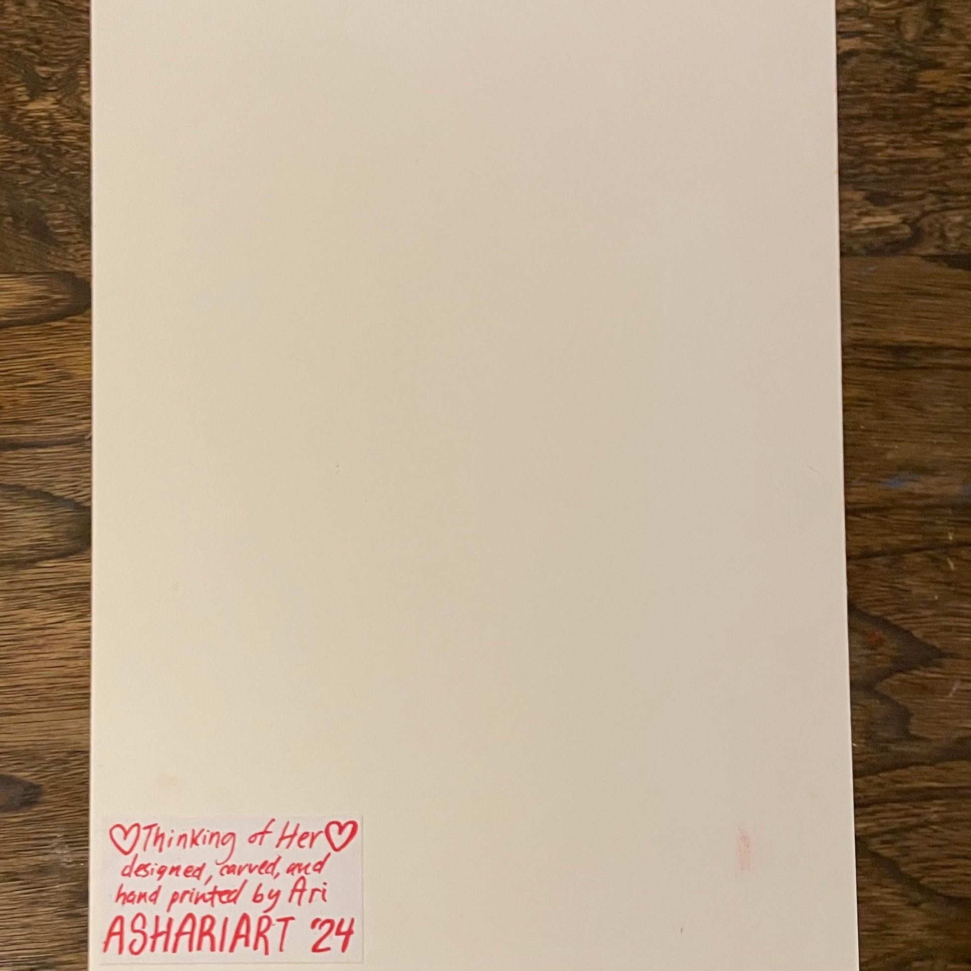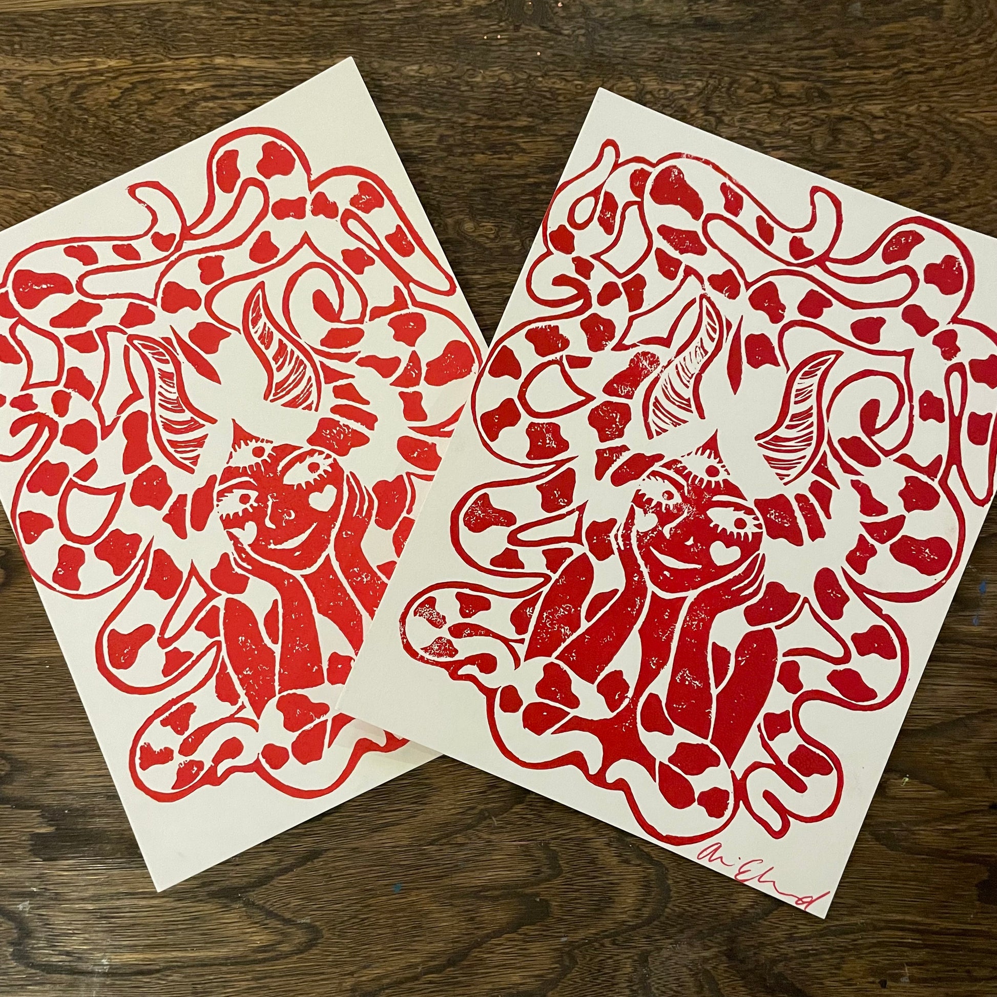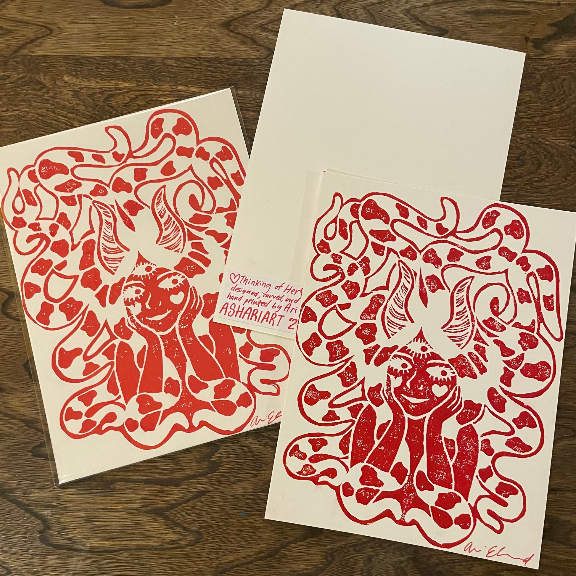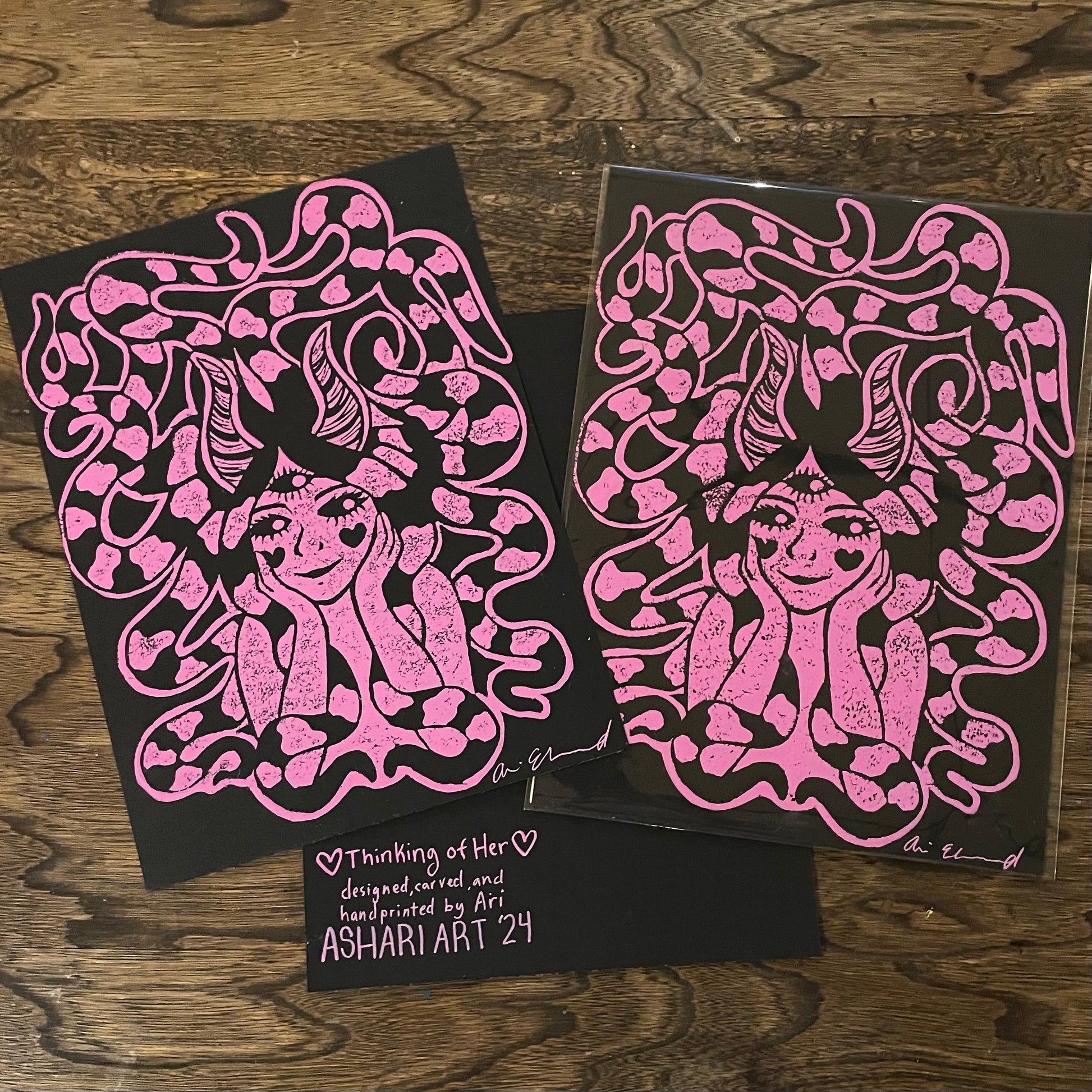 Jump into spooky season with this cute demon girl thinking about her crush. This design was hand carved and printed by Ari with love on heavy 9x12” paper.