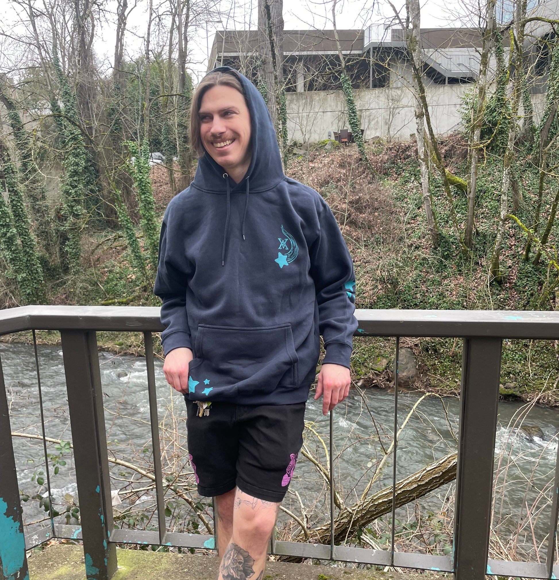 This was designed, hand carved, and hand printed by Ari with teal ink on navy color 80% cotton 20% recycled polyester hooded sweaters from Lane Seven. They are unisex sized and preshrunk.