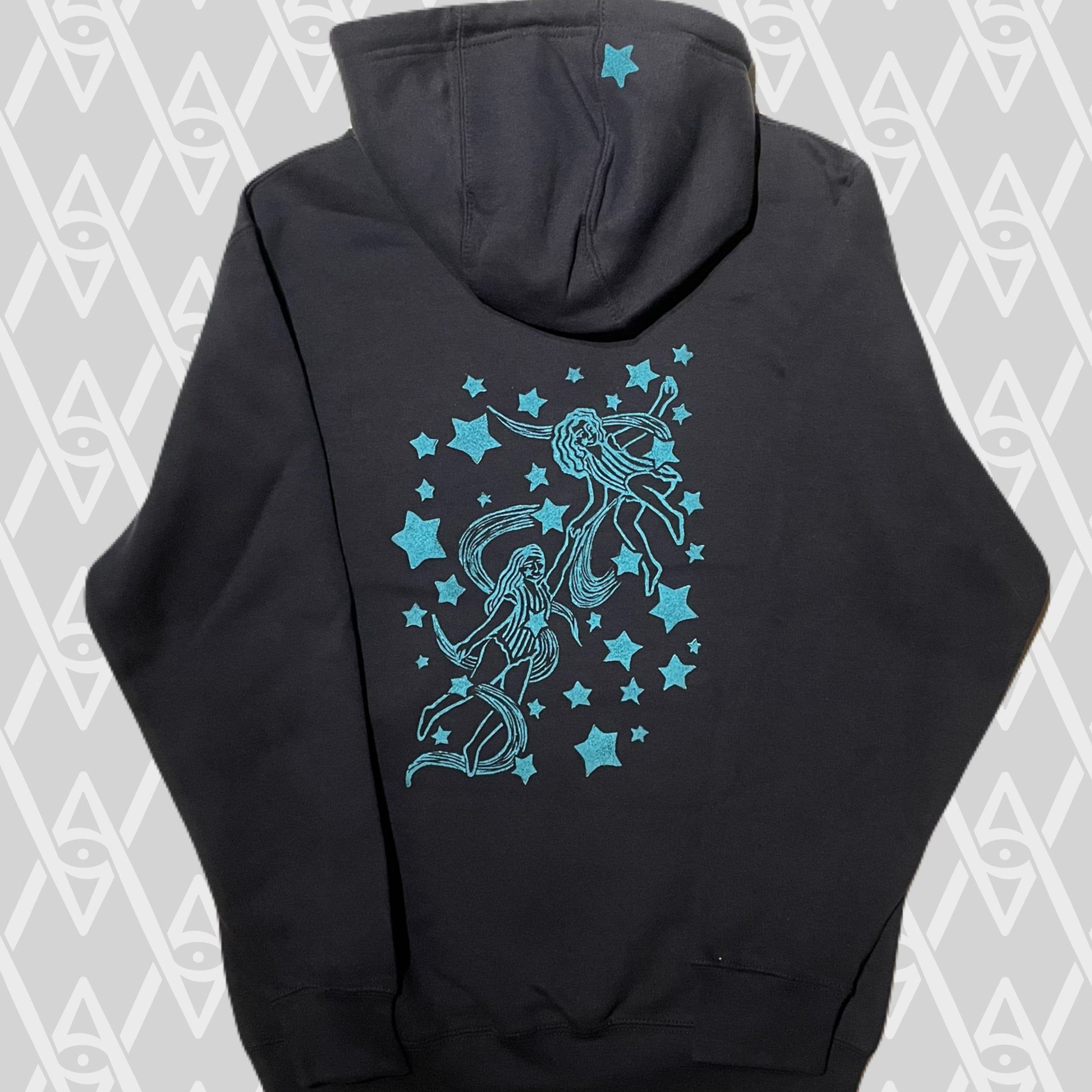 Two ladies hand in hand, wrapped in shooting stars and enjoying the ride as they traverse the galaxy! In addition to the main design featured on the back, there are matching stars on the hood, sleeves, front, and pocket.