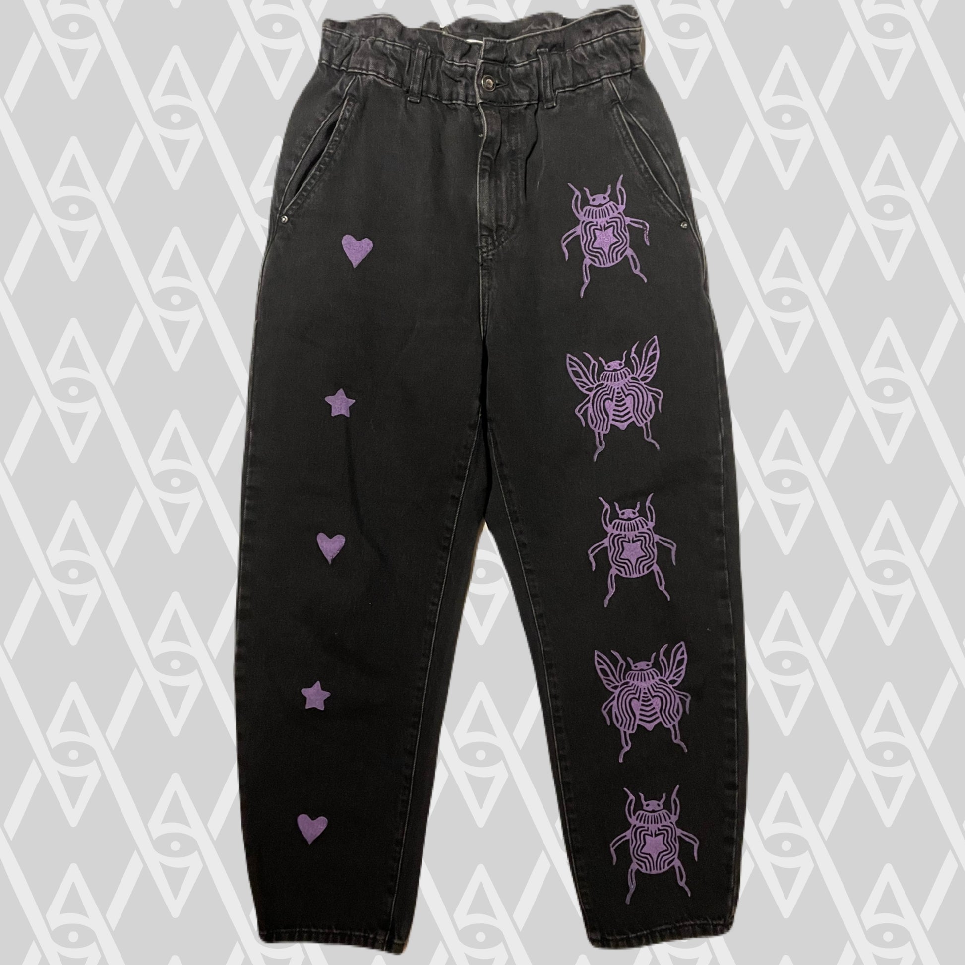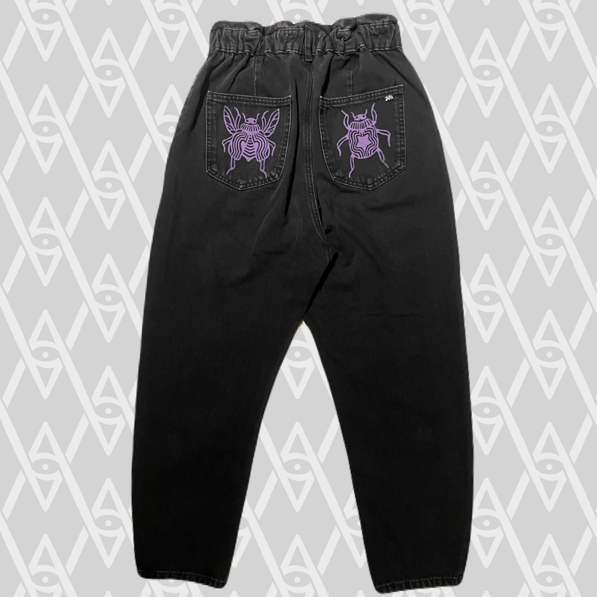 Purple beetle stamps on black jeans.