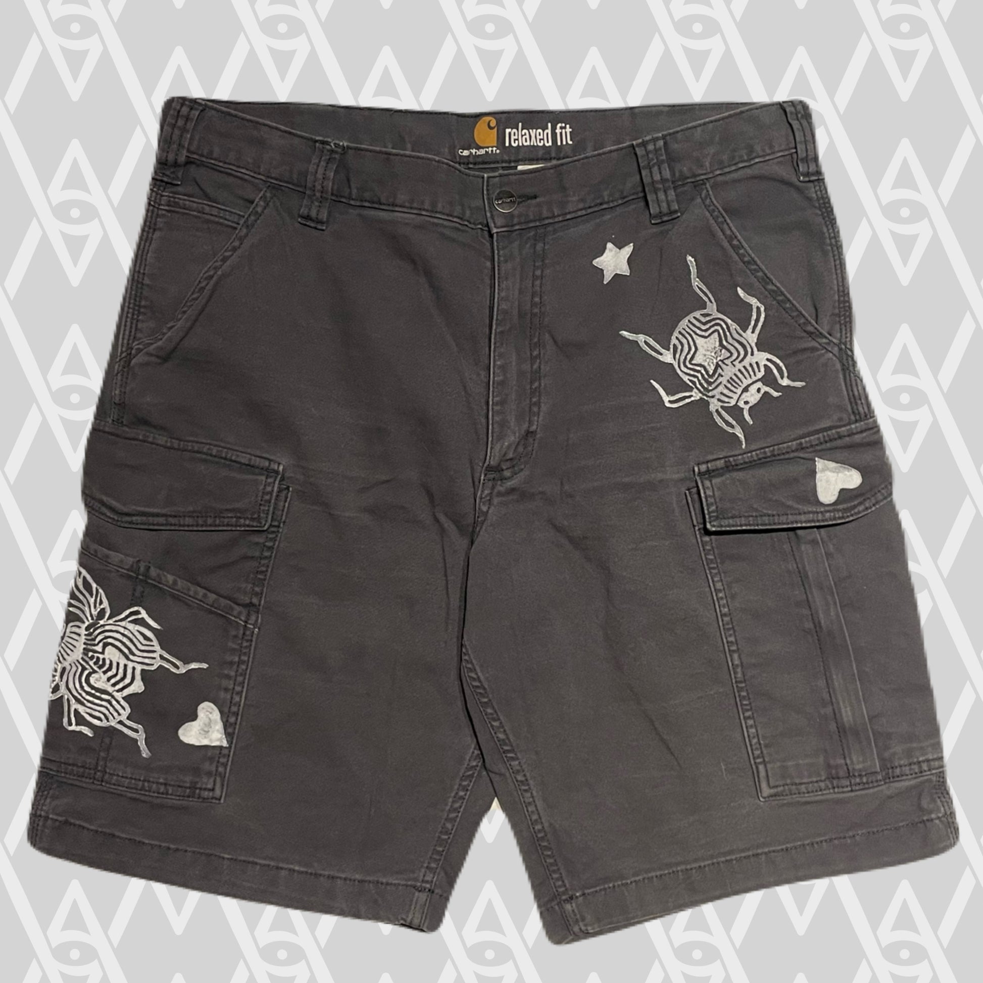 White beetle stamps on grey shorts.
