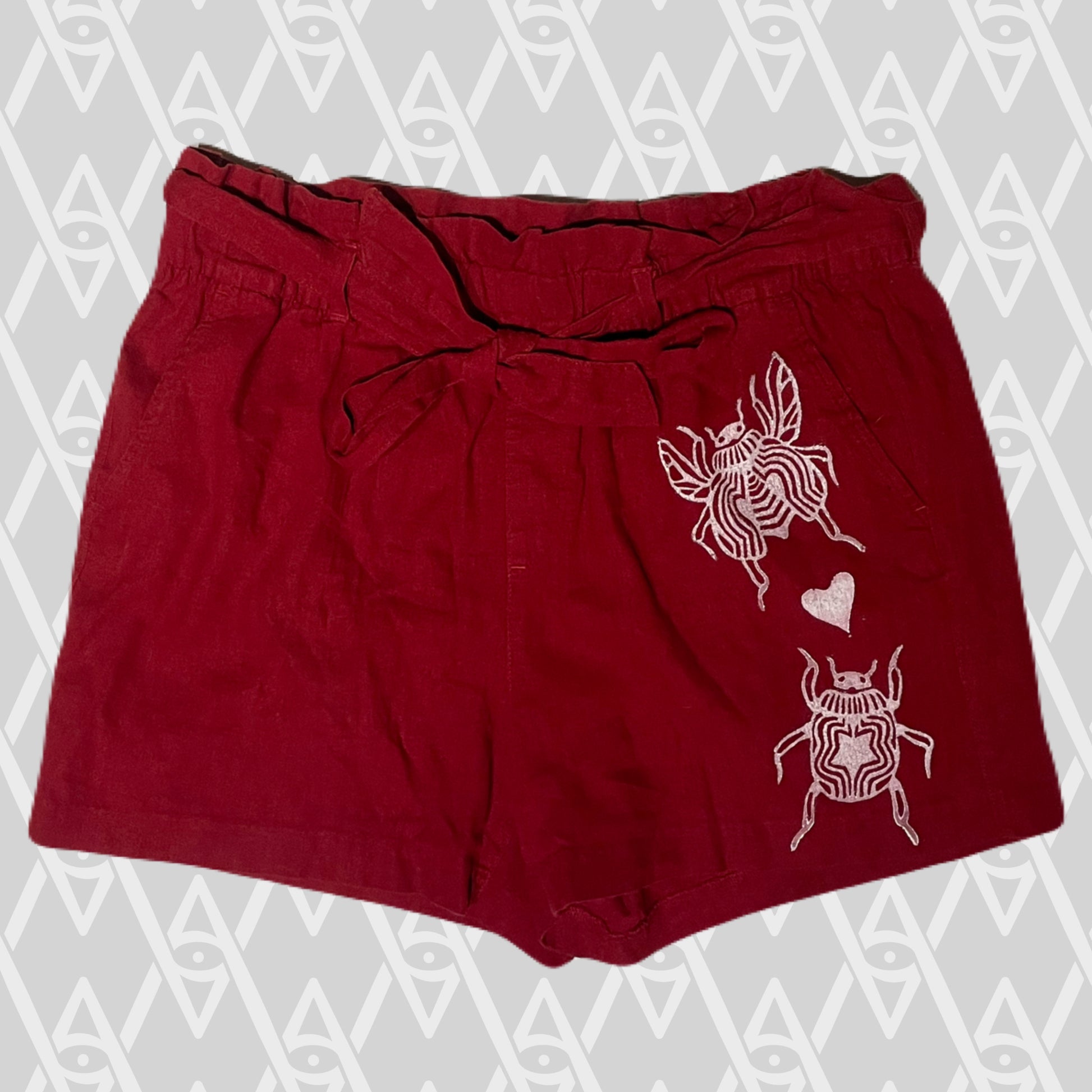 White beetle stamps on red 55/45 linen/rayon shorts.