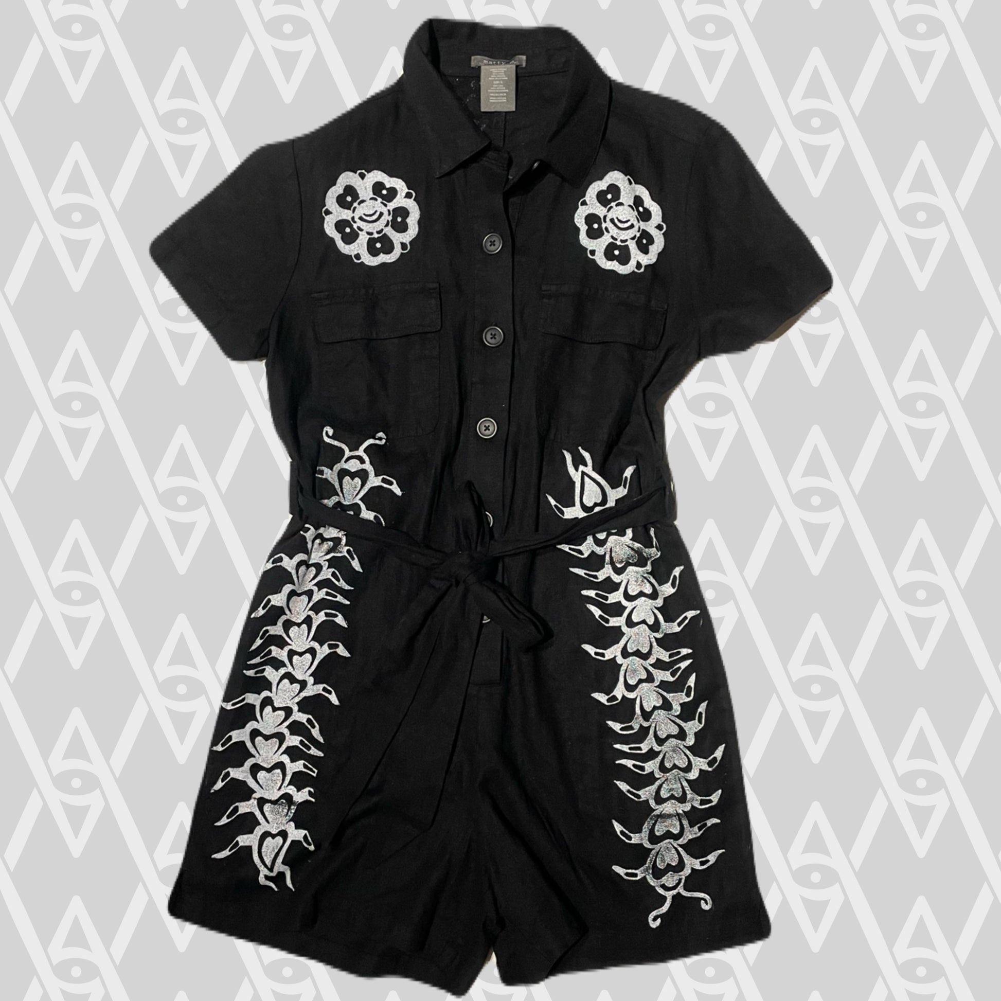 Heartipedes and flowers printed in white ink on black 55/45% linen/viscose romper.